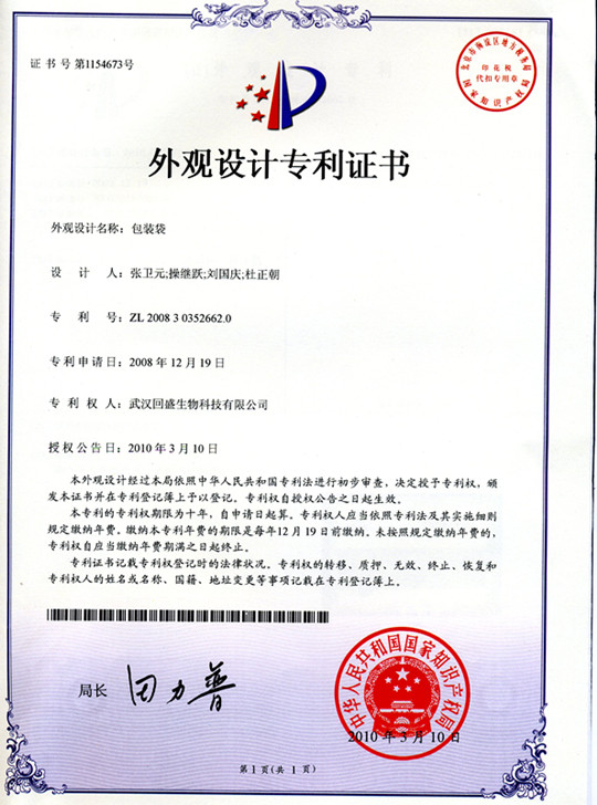 外觀設(shè)計專利證書(袋專利)